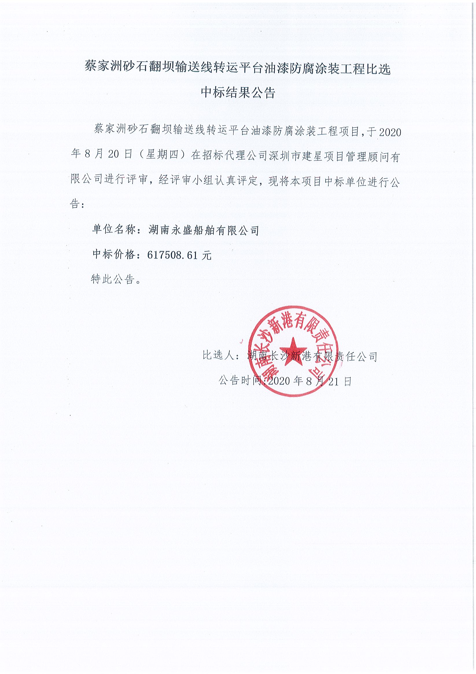 蔡家洲砂石翻壩輸送線(xiàn)轉(zhuǎn)運(yùn)平臺(tái)油漆防腐涂裝工程比選中標(biāo)結(jié)果公告