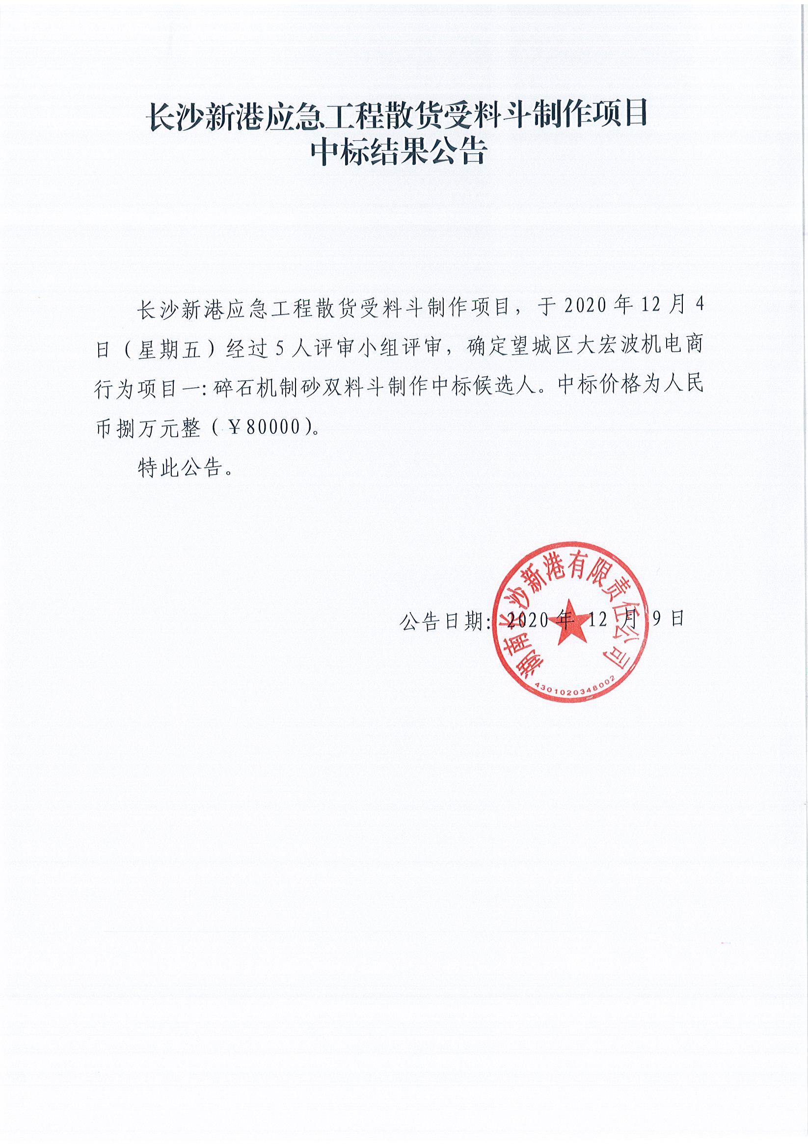 長(zhǎng)沙新港應(yīng)急工程散貨受料斗制作項(xiàng)目中標(biāo)結(jié)果公告