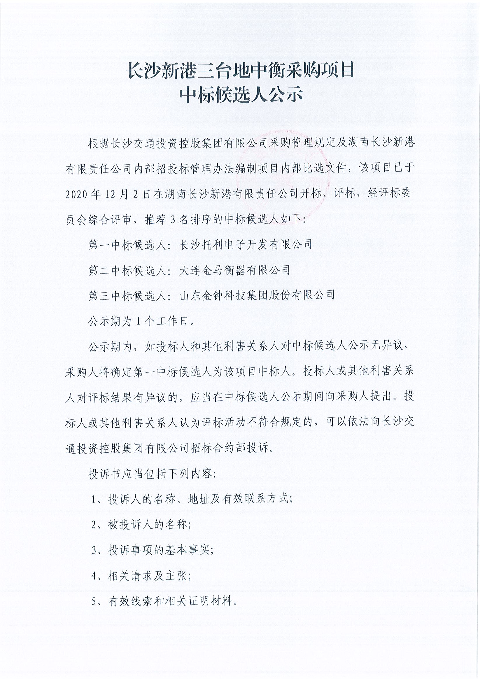 長沙新港三臺(tái)地中衡采購項(xiàng)目中標(biāo)候選人公示