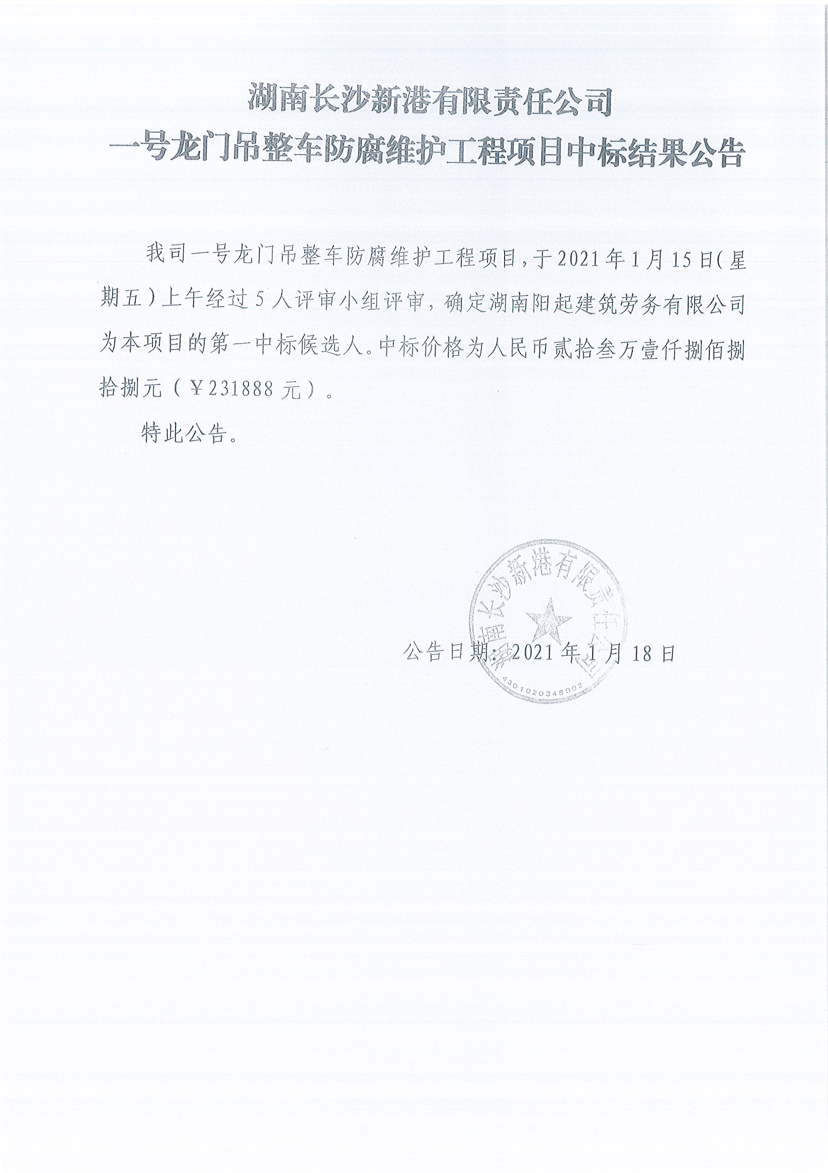 湖南長沙新港有限責(zé)任公司一號(hào)龍門吊整車防腐維護(hù)工程項(xiàng)目中標(biāo)結(jié)果公告