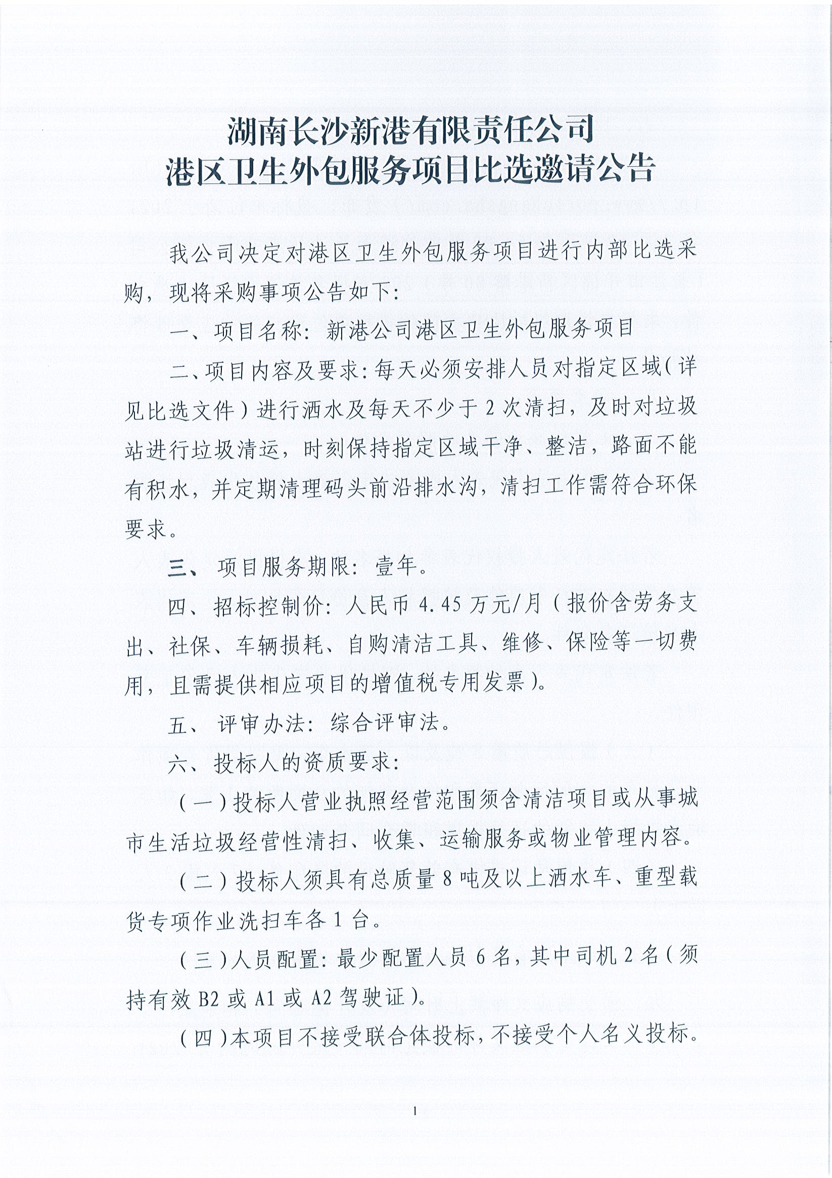 湖南長沙新港有限責(zé)任公司港區(qū)衛(wèi)生外包服務(wù)項目比選邀請公告
